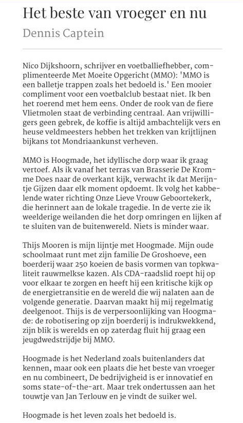 Columnist Dennis Captein wijdde afgelopen week mooie woorden aan ons dorp in het AD Groene Hart. Lees het hieronder in de schermafbeelding van het stuk.