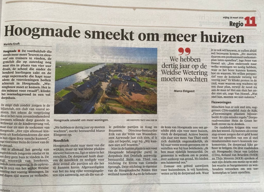 “Hoogmade smeekt om meer huizen” kopte het Leidsch Dagblad daags na een inspirerende bijeenkomst in het Drieluikte Hoogmade. Op uitnodiging van de Dorpsraad bezochten de raadsleden van Kaag en Braassem op 27 maart ons dorp, het thema: woningbouw.