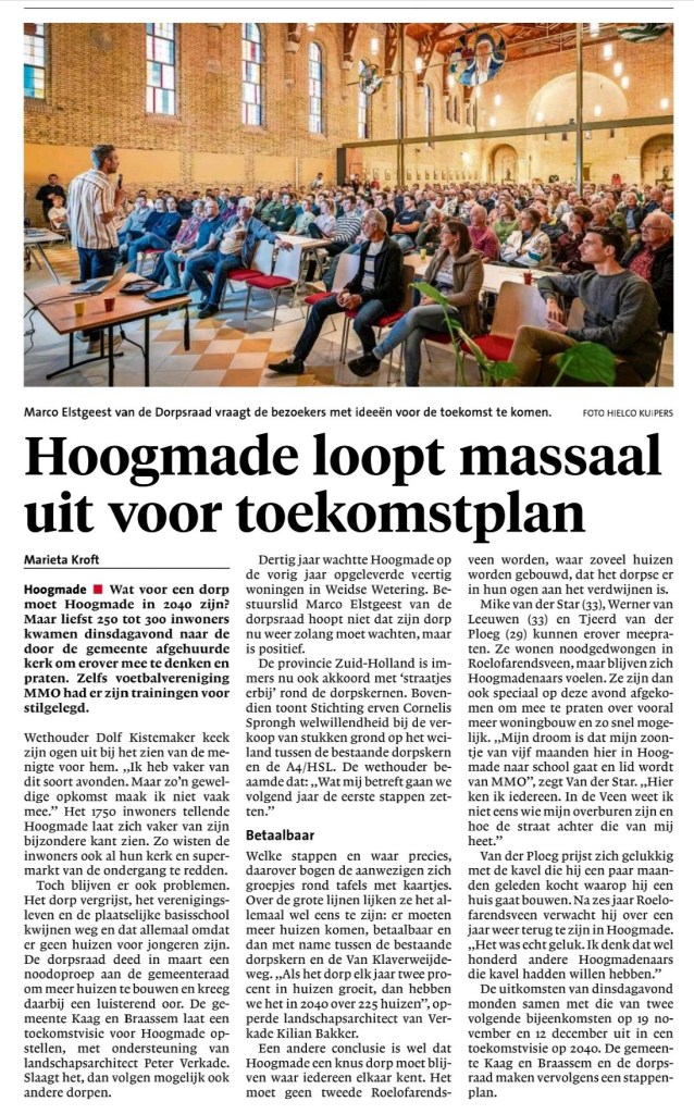 En vergeet niet: zet de 2e bijeenkomst alvast in je agenda. Op dinsdag 19 november bespreken we mogelijke scenario voor Hoogmade, op weg naar 2040!
