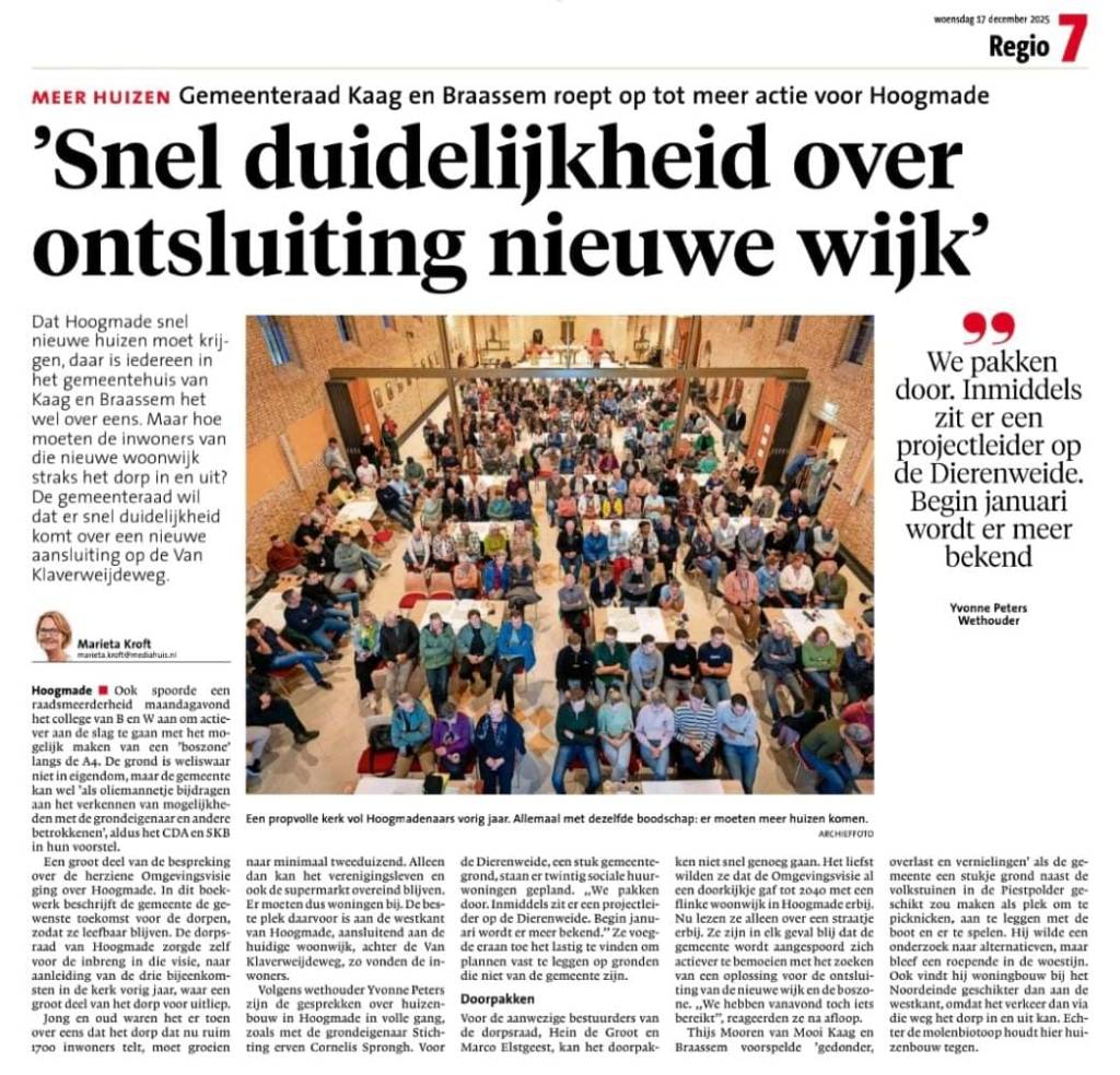 In de raadvergadering van 15 december heeft het college van B&W toegelicht zich onverminderd in te zetten om woningbouw in Hoogmade een stap verder te brengen. Motie 1 verzocht het college om woningbouwontwikkeling in Hoogmade dan ook in stappen tot 2040 concreet te maken. Dit was kennelijk een stap te ver omdat deze motie werd ontraden door het college, waarna de motie in de gemeenteraad geen meerderheid vond. Tegelijk zien we onze buurgemeente Alphen aan den Rijn deze week maar liefst een half miljoen (!) uittrekken om een ‘tiptop-plan’ voor het al even zo vergrijzende Koudekerk uit te werken. Hiermee wil Alphen aan den Rijn goed voor de dag komen bij de provincie met een verzoek om woningbouw. Hier kijken wij vanuit Hoogmade toch enigszins jaloers naar. Dorpsraad Hoogmade is niet ontevreden waar we nu staan en ziet dat woningbouw in Hoogmade op de agenda staat. Tegelijk is er afgelopen jaar weer veel energie geleverd om onder de aandacht te blijven op het gemeentehuis. Wij denken nog steeds dat meer initiatief nodig is én ook mogelijk is, om een beheerste groei van ons dorp op gang te brengen en te bereiken.