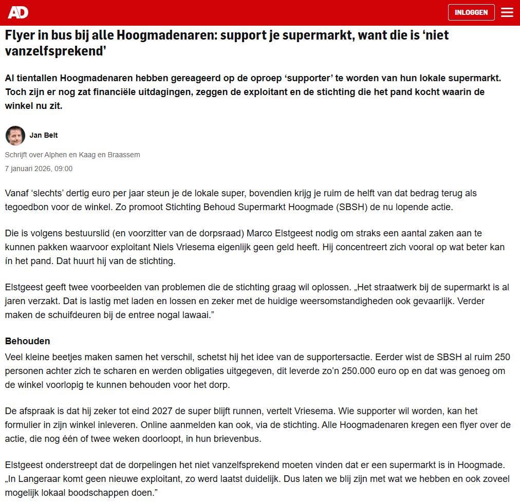 Tussen de feestdagen door hebben veel dorpsgenoten (en omgeving) al de moeite genomen om ons een ingevuld formulier retour te sturen. Hartelijk welkom als supporter van de supermarkt! Zit jij hier nog niet bij? De inschrijving loopt nog door en we zetten nog graag die eindsprint in. Vul bijgaand formulier in en zegt het voort! Want… elke supporter telt en vele kleine bijdragen maken samen iets groots. Het AD schreef er vandaag onderstaand artikel over.