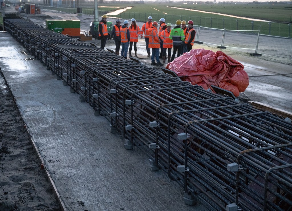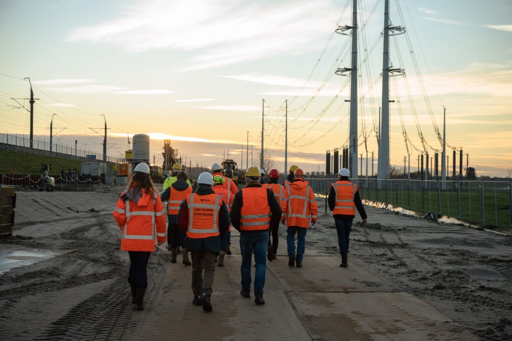 Na de presentatie werden we als bouwplaatsbezoekers, voorzien van veiligheidshelmen, -schoenen en -hesjes, meegenomen voor een rondleiding. De werkdag was op dat moment voorbij en alle machines stonden stil. Stephan en Mario leidden ons langs verschillende onderdelen van het project. Onderweg werd uitgebreid uitleg gegeven over de aan te brengen stabiliteitsconstructie van stalen palen, de logistieke uitdagingen en de veiligheidsmaatregelen die dagelijks genomen worden. Als bezoekers konden we van dichtbij zien hoe het werk wordt uitgevoerd, wat vooral indruk maakte door de schaal en precisie waarmee gewerkt wordt.